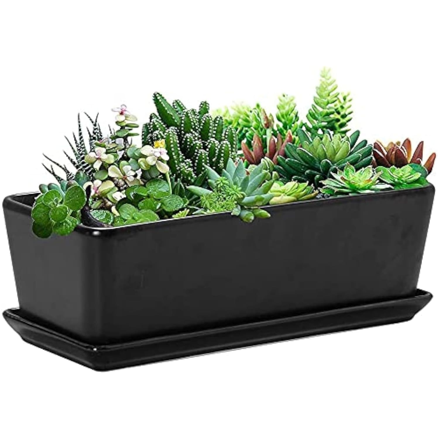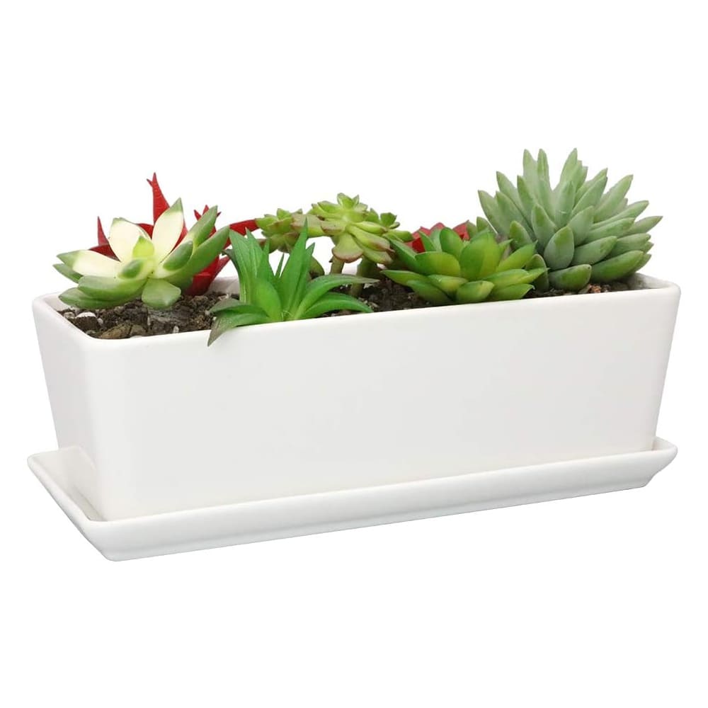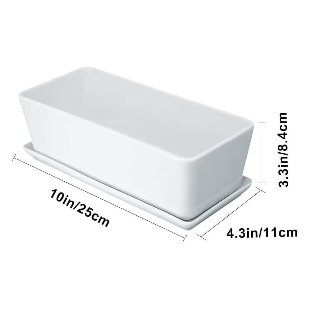 10 inch Ceramic Rectangular Succulent Planter Elegant White Window Box Flower Pot with Saucer for Indoor Plants