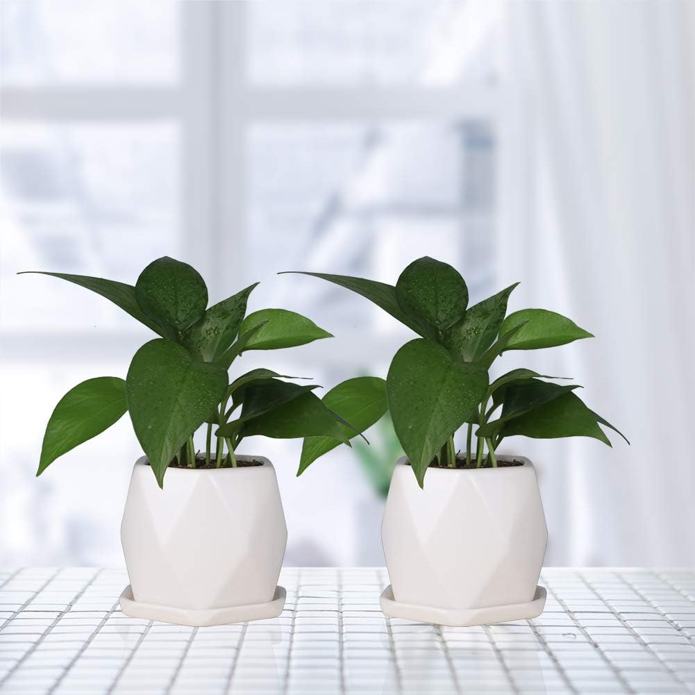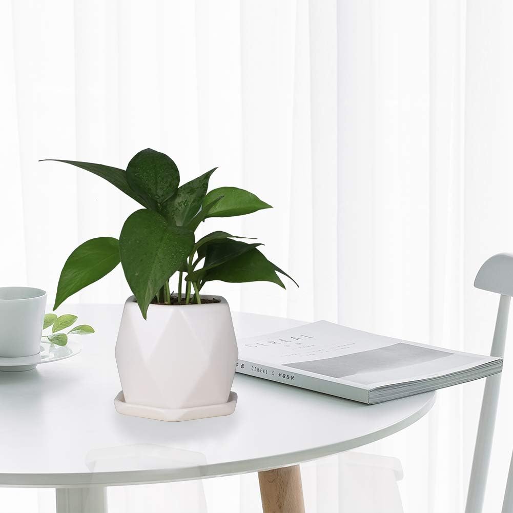 - Elevate your space with this 4"D x 3.7"H minimalist planter! Its sleek white geometric design complements modern, boho, or contemporary decor —a statement piece that’s equal parts art and function. The built-in drainage hole and matching 4"D removable saucer prevent overwatering, keeping soil healthy and surfaces tidy—perfect for succulents , small cacti, herbs , or even faux greenery for low-maintenance style!