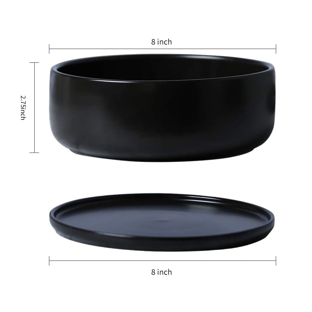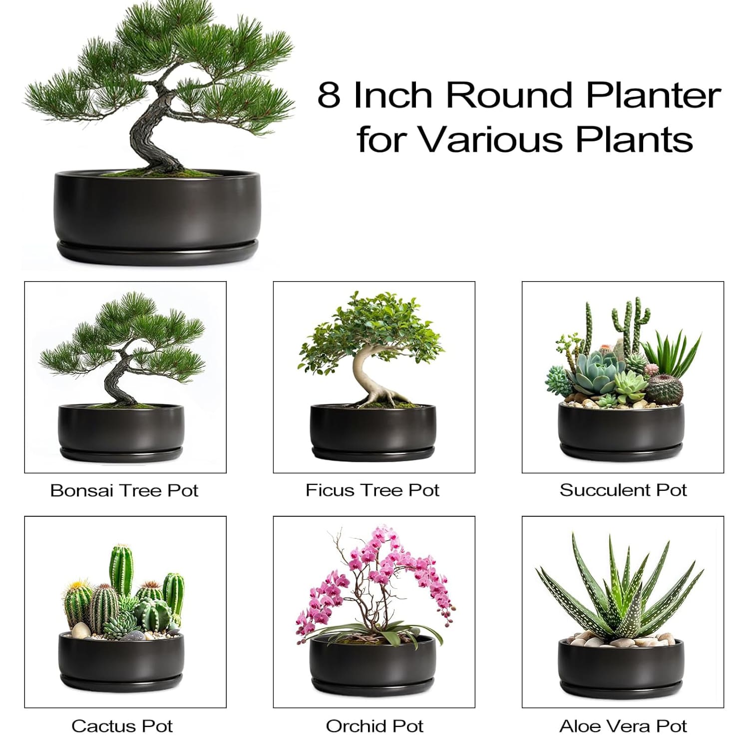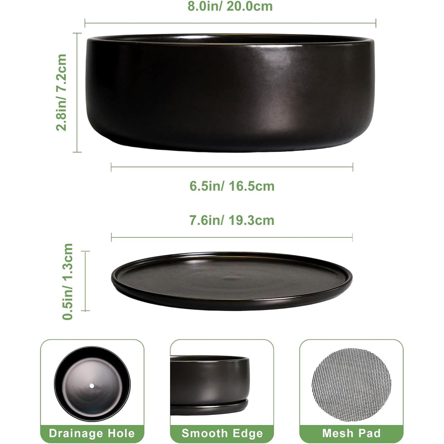Bonsai Pots - 8 Inch Ceramic Matte Black Plant Pots for Succulents, Round Indoor Planter with Drainage Hole and Saucer, Shallow Modern Planter Bowl, Room Decor